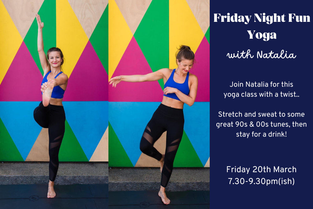 Whether you’re a seasoned yogi or are simply looking for a fun and healthy way to boost your mood, come and join us for 75 minutes of pure fitness fun, followed by a drink and chat with Nat and the group! (Non-alcoholic available!)